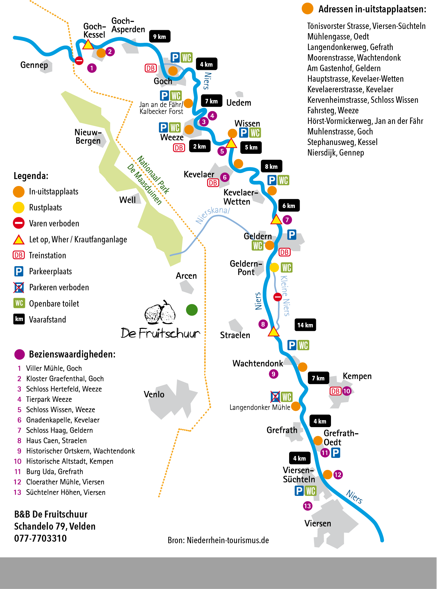 Een kanotocht over de Niers in Duitsland is erg populair. De Niers is een 114 km lange rivier net over de grens in Duitsland. Hij is bevaarbaar vanaf Süchteln bij Viersen tot Milsbeek in Nederland, waar hij in de Maas uitmondt. De Niers is 65 km bevaarbaar, waarvan 8 km in Nederland. In Duitsland zijn goede kano-faciliteiten langs de rivier. Er zijn kanosteigers en vaak is er ook een wc. De stroomsnelheid is doorgaans ongeveer 2 km/u. Kortom, voor iedereen is het goed te doen.